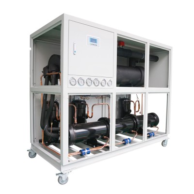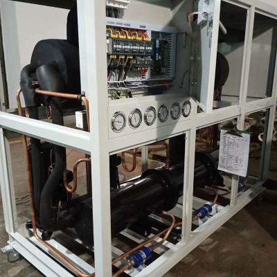 The chiller is a refrigeration system composed of a compressor, evaporator, condenser, and expansion valve. Its condenser (radiator) is a shell&tube style, and it exchanges heat to cool water for external cooling water tower and cooling water pump.